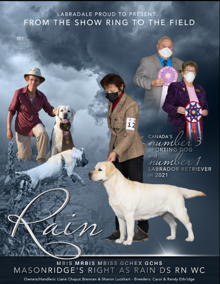 We actively show our Labradors competitively in both Canada and the U.S.A. We’ve been fortunate enough to have several of our dogs win top honours through the years, including multiple Best in Shows and Best in Specialty Shows, as well as High in Trials. As well as producing/owning several top five Labradors in Canada and one in the US. In fact Rain was top Labrador and Number 3 Sporting Dog in Canada in 2021. To our knowledge the only female to have this honour and first Labrador to be in top three sporting for over forty years. She truly represents the standard in beauty, brains and type.