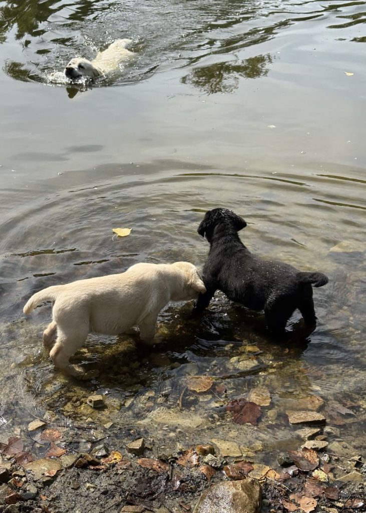 We also have his first litter here on the ground at Labradale, pictured below at eight weeks couple of the puppies on their first outing.
